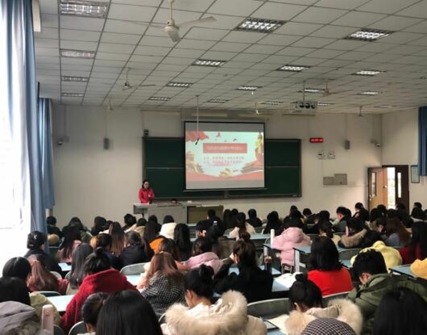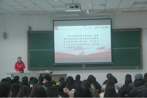 2019年12月11日,mansion88明升党总支学生支部在知津楼第九阶梯教室组织开展了“不忘初心、牢记使命”主题教育专题党课。党课由学生支部副书记、2018级辅导员高远老师主讲,学院全体学生党员、入党积极分子共计200余人聆听了党课。