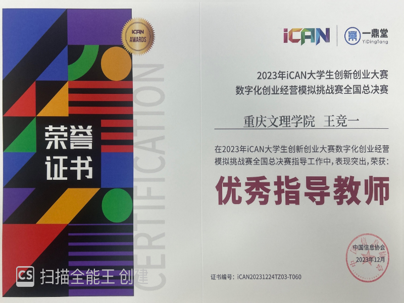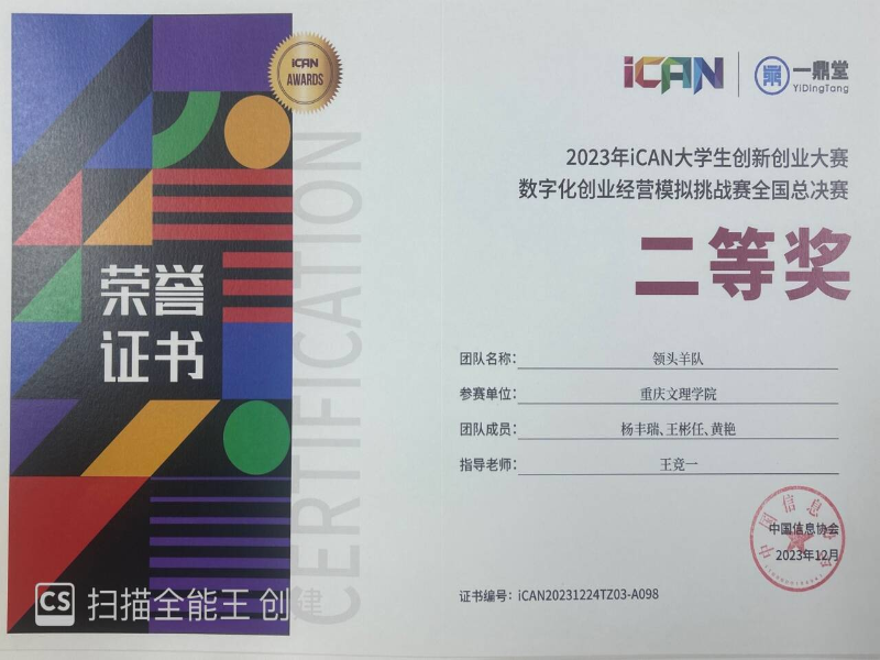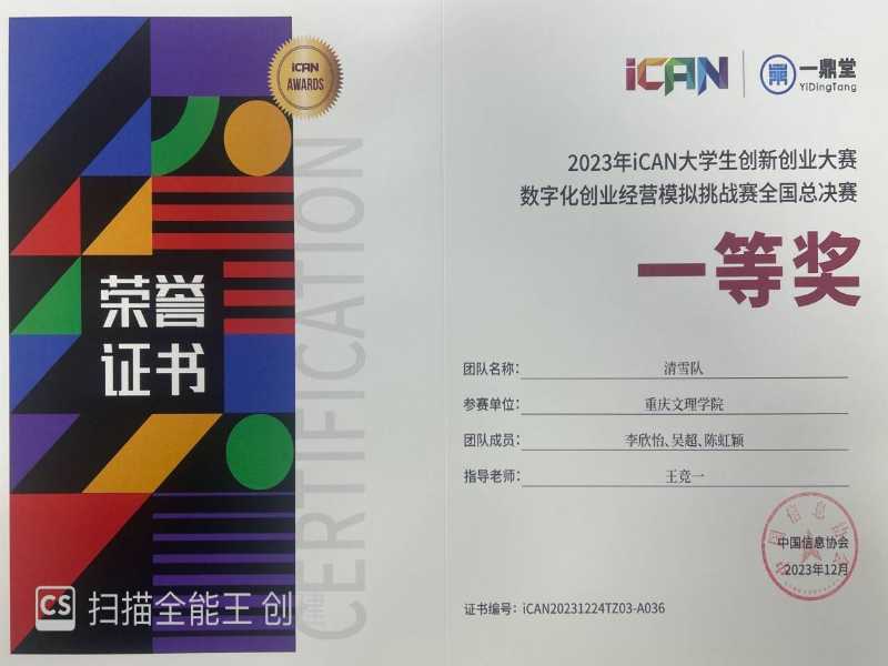 2023iCAN大学生创新创业大赛数字化创业经营模拟挑战赛以数字化创业经营为主题,将创新创业与数字化技术相结合,参赛团队需在模拟环境中进行创业策划、团队组建、运营管理、市场竞争等环节的实践操作。大赛分为校赛、区域赛、国赛初赛、国赛总决赛四个阶段,共吸引了全国1500多所高校6000多支队伍近17万人报名参加,经过各环节的层层选拔,最终遴选出109支队伍进入全国总决赛。经过激烈角逐,mansion88明升清雪队、领头羊队两个学生团队分获总决赛一等奖和二等奖,指导教师王竞一获得“优秀指导老师”称号,充分展示了我学生扎实的专业知识和良好的综合能力